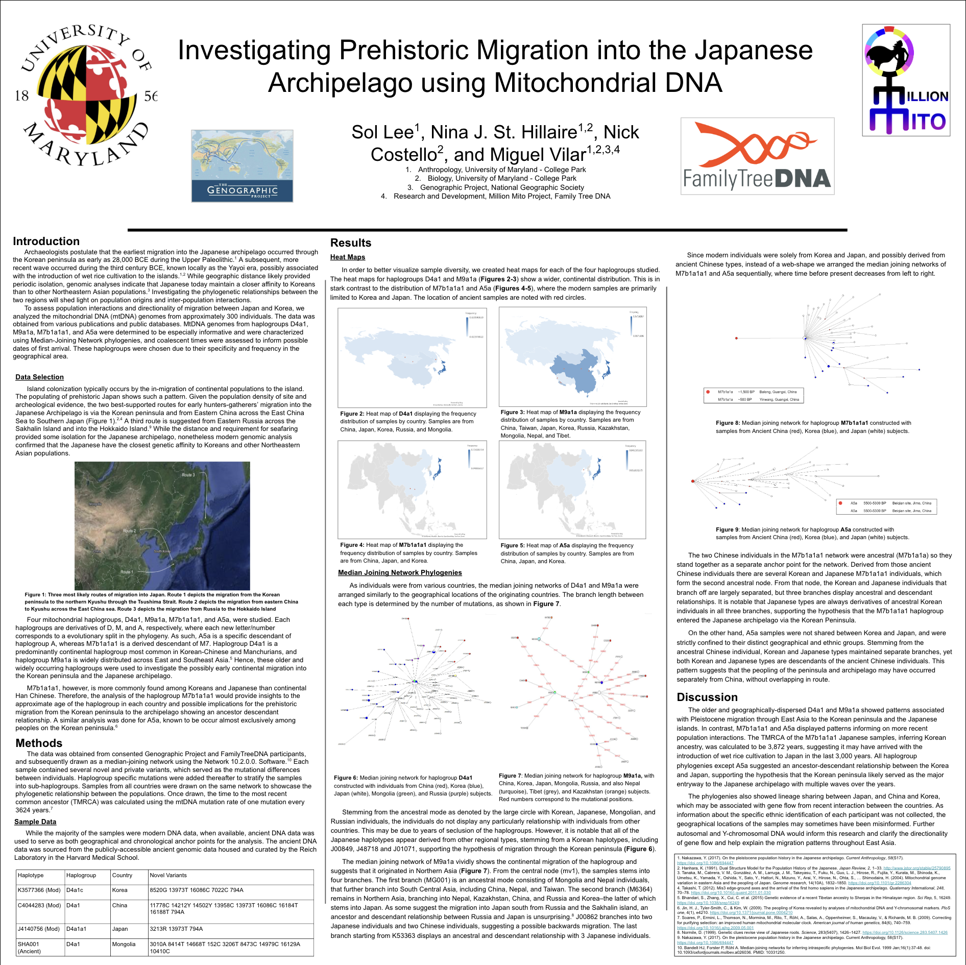 Sol used country-level haplogroup frequencies and phylogenetic networks to investigate the ancient migration of people into Japan. The concentrations of two prominent haplogroups were used to estimate a split between the populations about 4000 years ago.